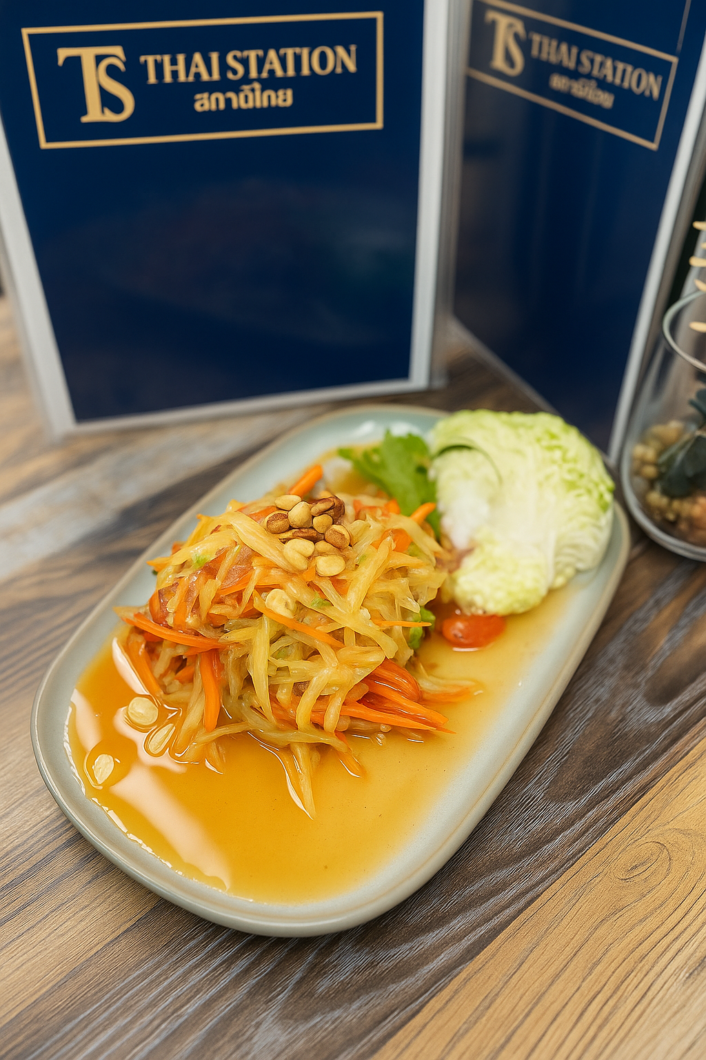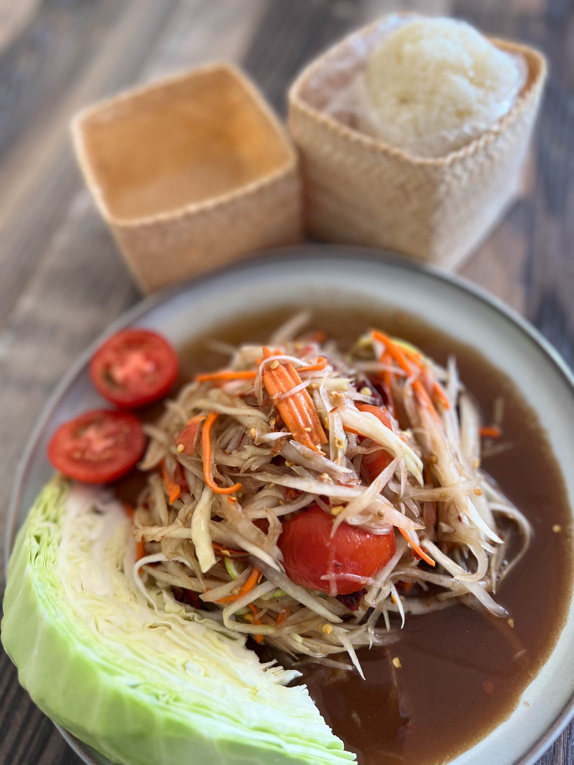Papaya, vermicelli, pork baloney, tomatoes, chili, Thai eggplant, sauce.