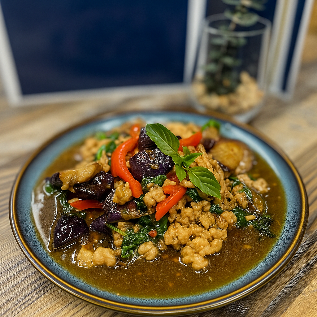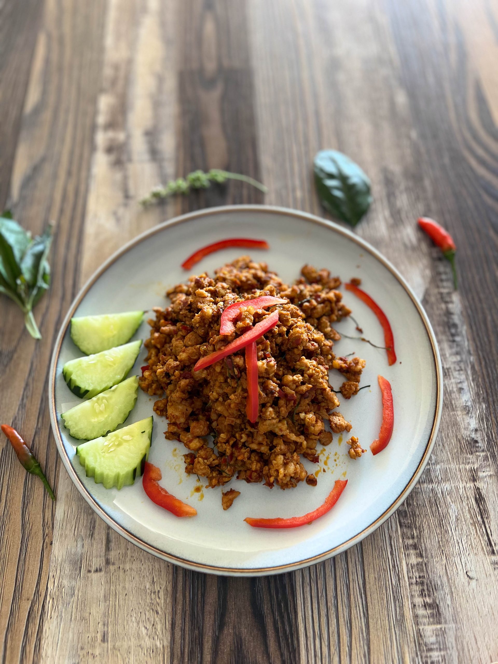 Choice of ground Chicken or ground PorkTraditional southern Thai dry curry stir-fried with meat and aromatic herbs topped with kaffir lime leaves.