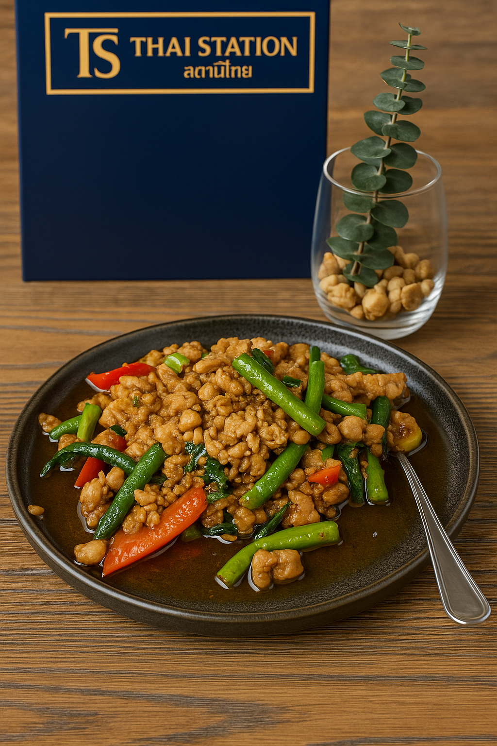 Stir-fried crispy pork belly with spicy red curry paste and green beans.