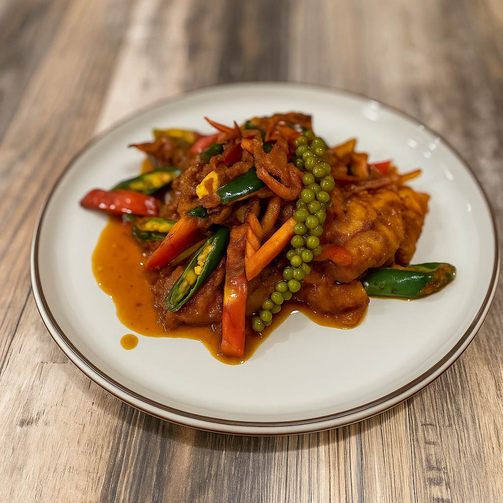 Stir-fried catfish with Thai red curry paste, chili and kaffir lime leaves.