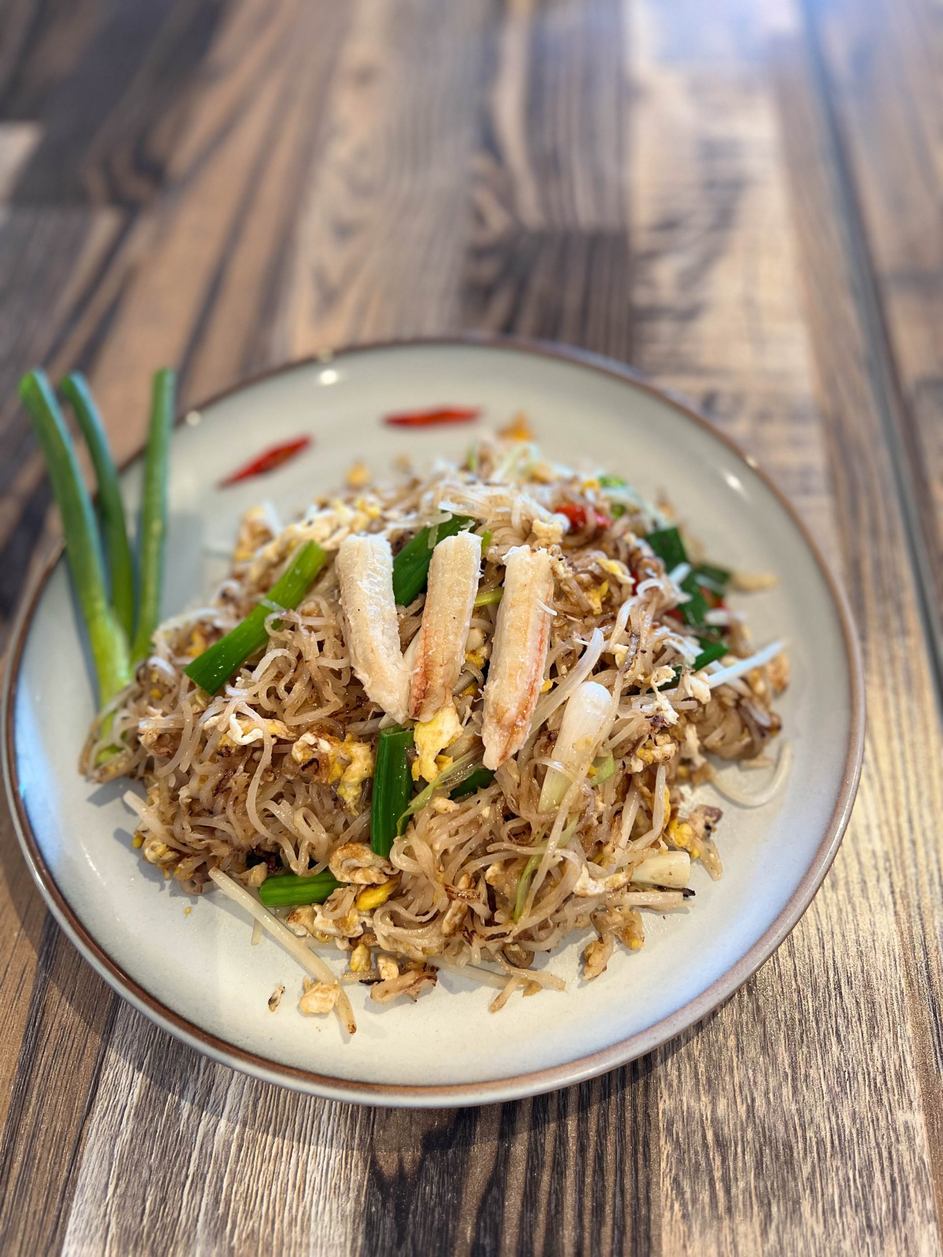 Stir-fried Thai rice noodle with crab meat, egg, green onion and special Thai sauce.
