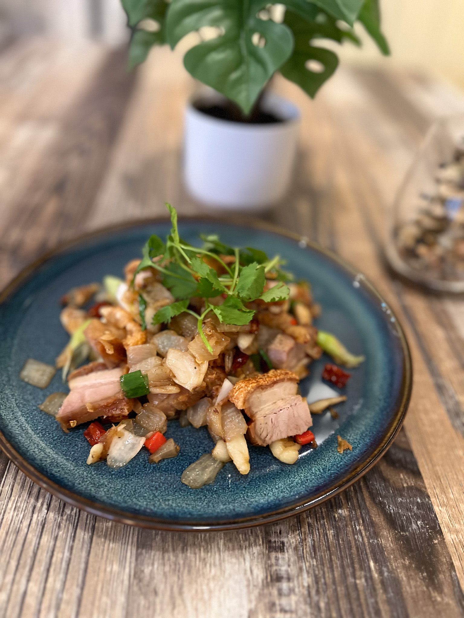 Stir-fried crispy pork with Thai roasted chili, white onion and special sauce.
