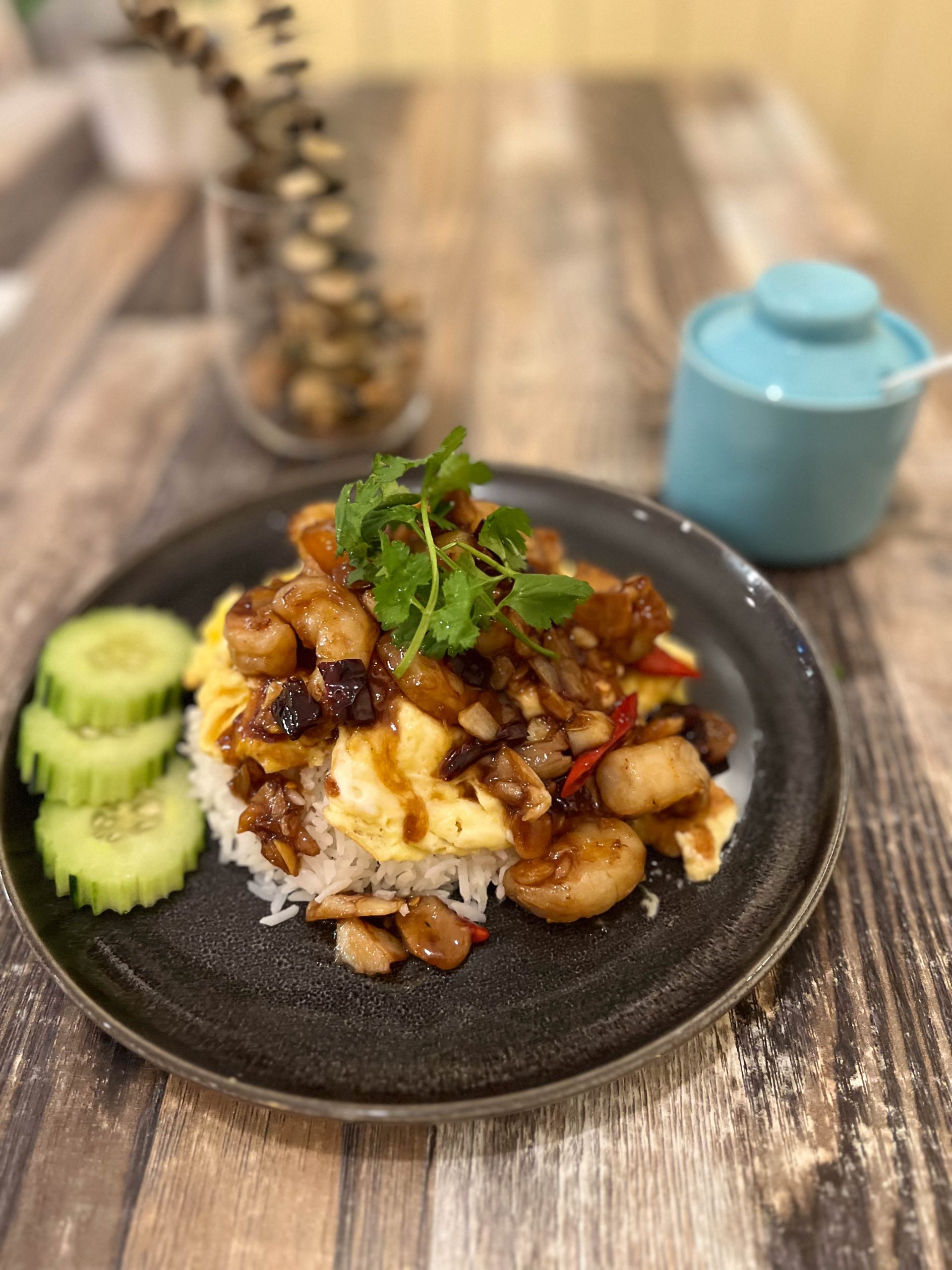 Stir-fried shrimp with bird’s eye chili, garlic, white onion and creamy egg.