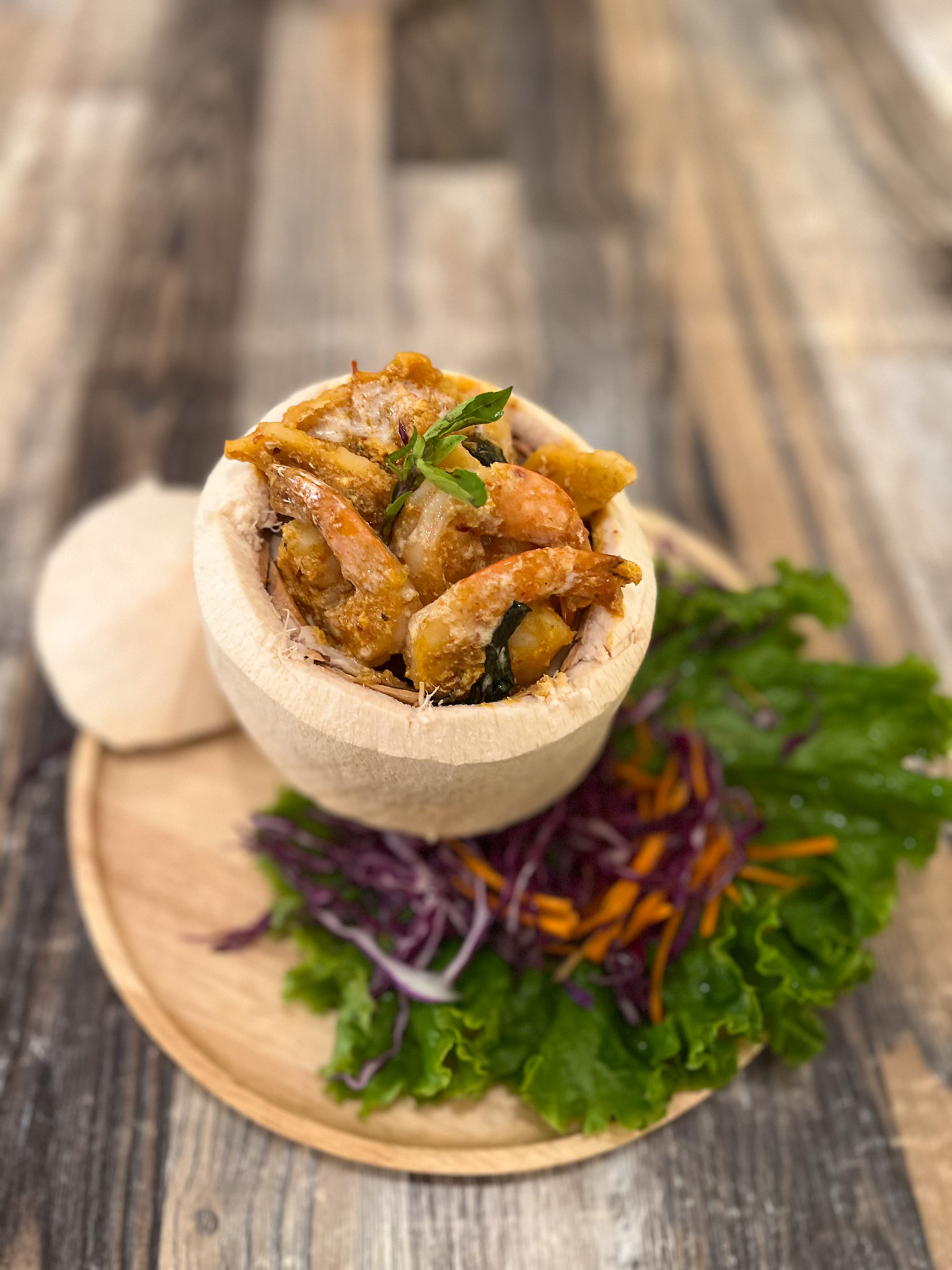 Steamed Thai seafood (shrimp, fish, squid, green mussel) in red curry with coconut milk and egg, served in a young coconut shell.
