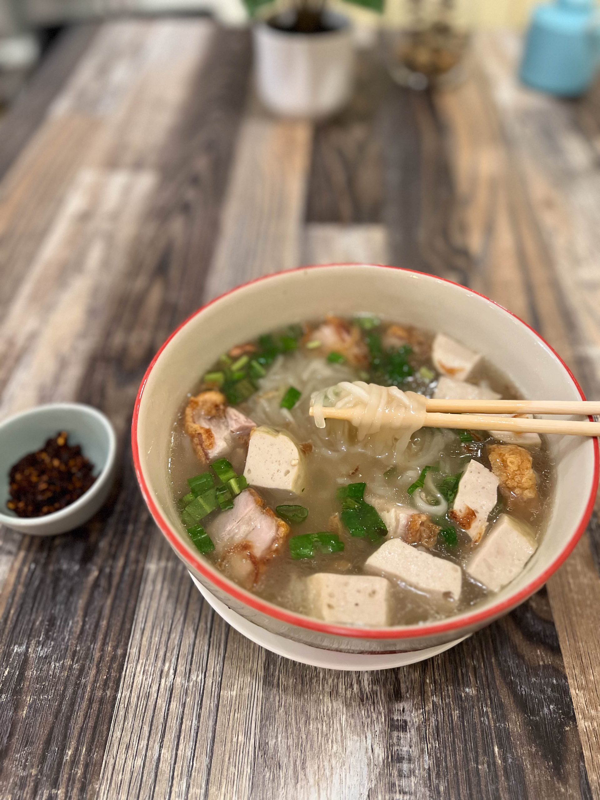 Homemade rice noodle in rich pork broth with pork baloney and crispy pork, topped with fried shallots and cilantro.