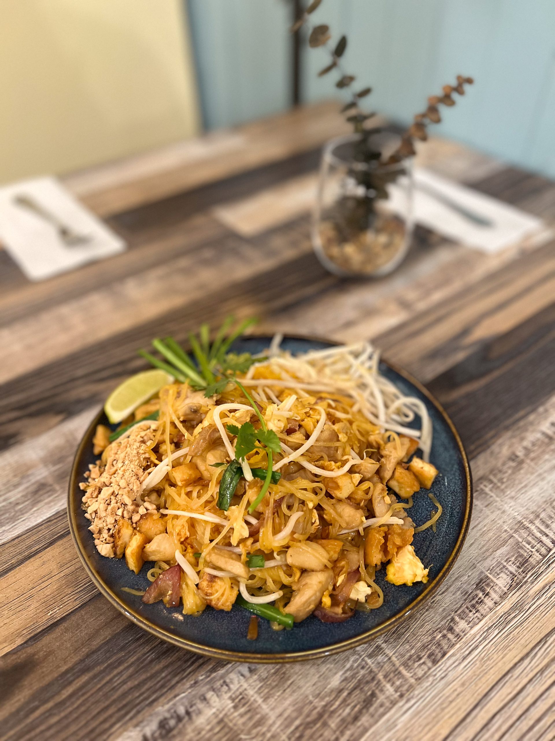 Pad Thai Available Monday–Friday 11:00 AM – 3:00 PM…..Served with rice & crispy wontons(Add Thai Tea or Coffee $3)